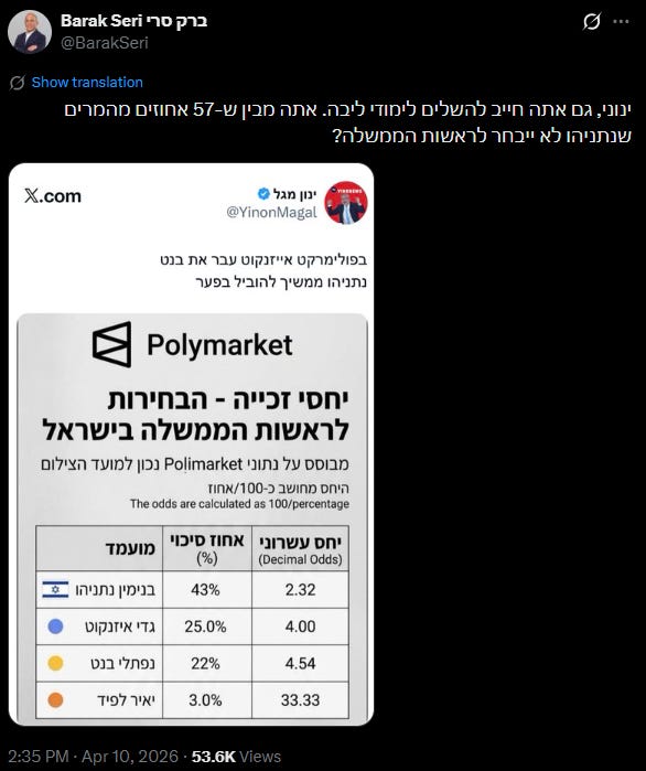לקראת הבחירות בישראל, עולה בזירת השיח הפוליטי המקומי שם שהפך בשנים האחרונות למעין גורו של הקפיטליזם הדמוקרטי - הפולימרקט. בישראל, כידוע, כולם מומחים להכל, והמומחיות הפופולרית החדשה כוללת צילום מסך מהפולימרקט או קאלשי (מכאן ואילך אני משתמש רק בפולימרקט כדוגמא) ונסיון לפרש את המסר שמסתתר מאחורי התפלגות האחוזים שמופיעה שם. השבוע נתקלתי בציוץ הבא: